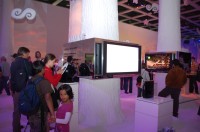 BRAVIAの一斉展示や“ゴールデン・ショーケース”が外周を取り囲むホールを、さらに中央へ向かって分け入っていくと、広々とした“森”のようなスペースにたどり着く。四方を取り囲む白壁にはアンビエントな映像が映し出され、雷鳴やジャングルの生物たちの鳴き声のような聴覚・視覚のスペクタクルが演出される。時折ダンサーのパフォーマンスとともに、ZX1やSountinaなどハイライト商品の映像が壁面に映し出されるショウタイムもある。会場の床から天井まで延びる樹木を模した支柱の周りには、PS3やPSPなどゲーム機の体験コーナーや、“ウォークマン”、“ローリー”などソニーのユニークなオーディオが体験できるコーナーが設けられ、来場者をとことん楽しませる仕掛けも用意。まるで異空間に迷い込んでしまったような驚きのあるブースそのものに魅せられ、長い時間とどまっている来場者も多く見受けられた。